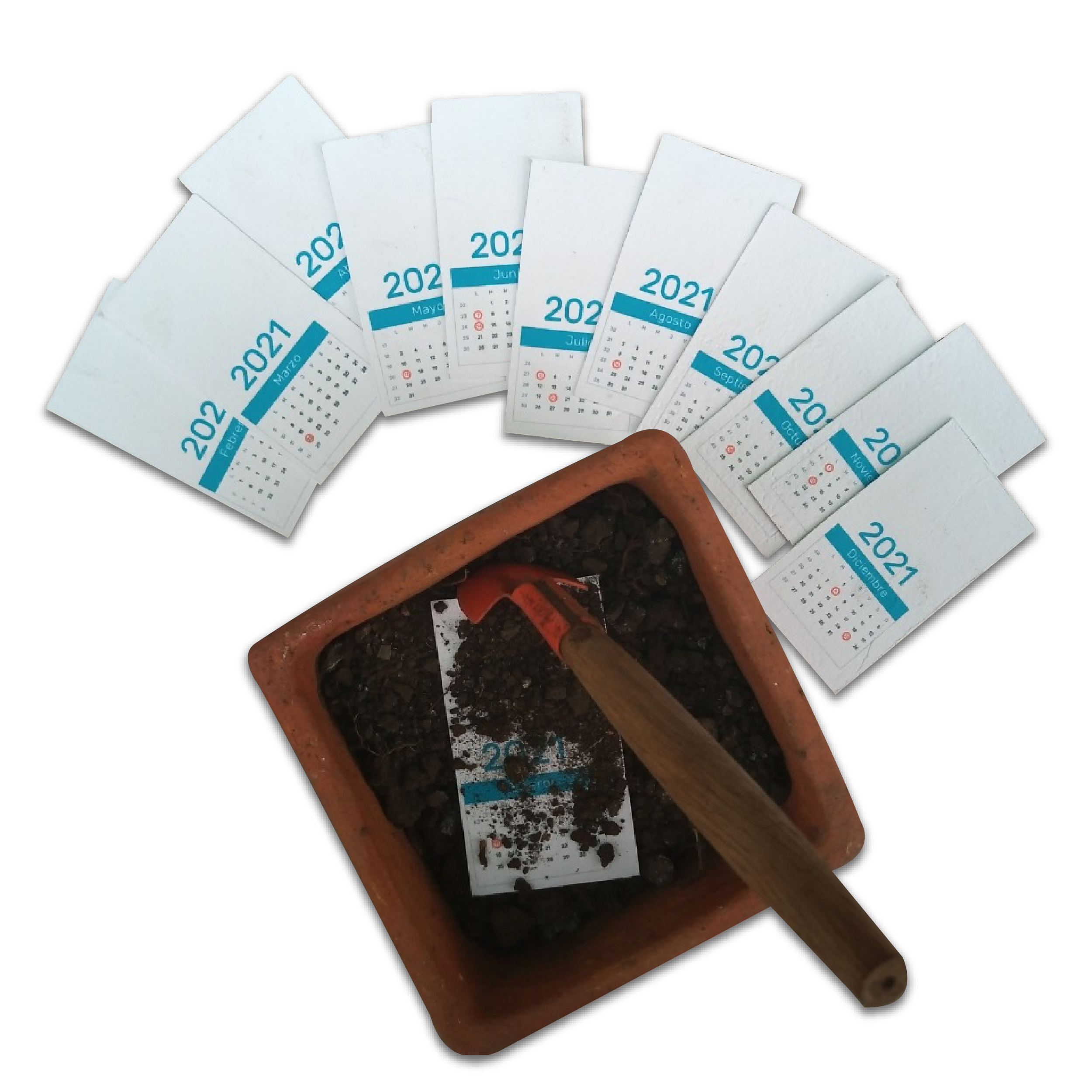 Un año de metas, un año de siembra. Nuestro calendario plantable es la herramienta de merchandising ideal para oficinas. Cada mes, una hoja de papel semilla Premium (10x13 cm) se siembra, germinando una especie diferente. Es la solución de economía circular perfecta que asocia tu marca responsable con el crecimiento, el bienestar laboral y el cumplimiento de metas, generando oxígeno y conciencia mes a mes.