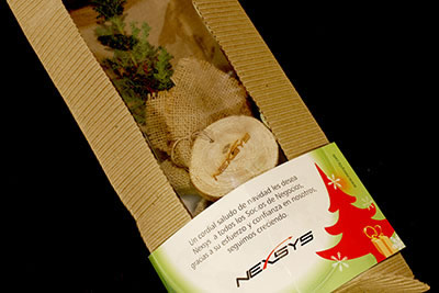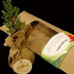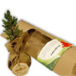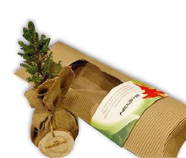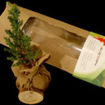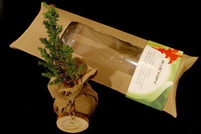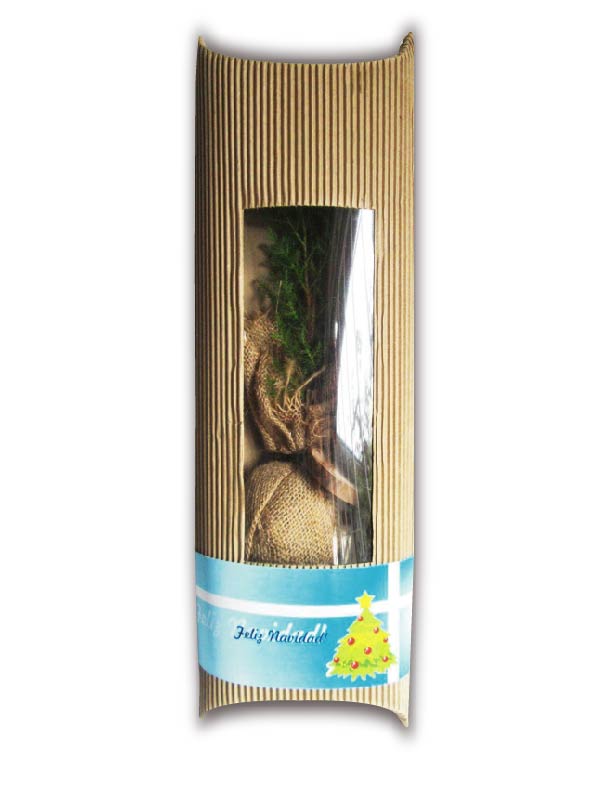 Pino y bonsai en saco de yute en caja. Regalos navideños personalizados