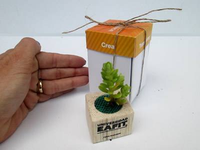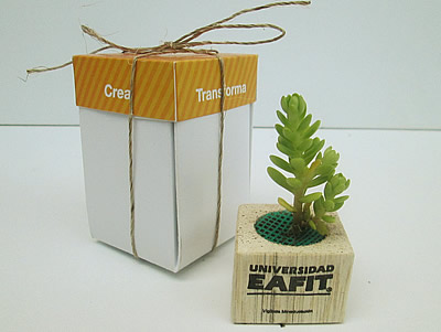 Las suculentas en matera de madera marcada a una tinta con un imán para adherir a un tablero, lampara, escritorio o una superficie imantada; son una opción de regalos ecológicos muy decorativa y novedosa.  Se entrega en una caja de regalo con la tapa personalizada full color.