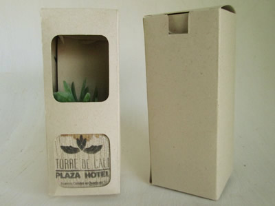 - Matera Artesanal: Cubo de madera de 4 cm x 4 cm, con un acabado natural que resalta la elegancia del logo marcado a una tinta.