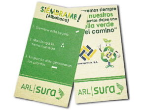 Tarjeta de presentación elaborada con papel semilla tamaño 9.0 cm x 5.0 cm con desprendible para sembrar y germinar una planta.